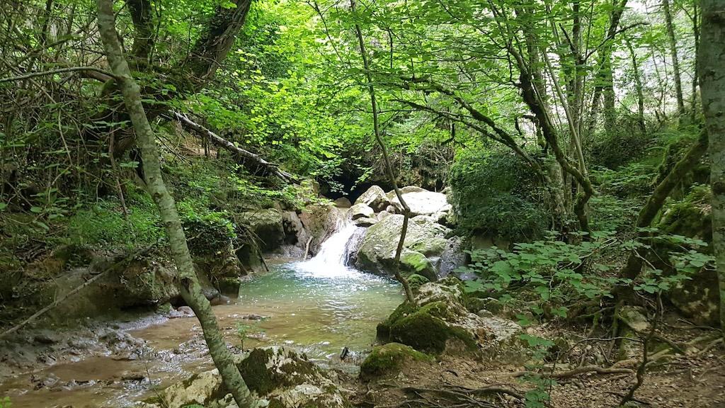 Conforme nos acercamos a la cascada de Aguake es el tramo más bonito de todo el recorrido. Las hayas, el serpenteante cauce del río, la cascada y las paredes verticales de roca caliza lo hacen muy especial.
